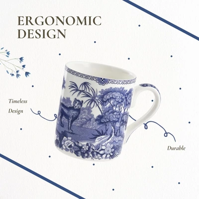 The Blue Room collection is named for the display room at the Spode factory where a wide assortment of blue and white transferware in archival patterns was exhibited. This generously sized 16 ounce mug features the lion and the fox from Aesop’s Fable The Fox and the Lion. Add an unmistakably heritage touch to the table. UPC: 749151505483 Product: Coffee & Tea Material: Fine Porcelain Dimensions: 16 oz Product Care: Dishwasher, Microwave, Freezer and Oven Safe