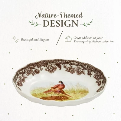 - Rustic Wildlife Design: Features a detailed pheasant illustration framed by Spode’s heritage British Flowers border in warm brown, adding charm to holiday dining or rustic décor displays.