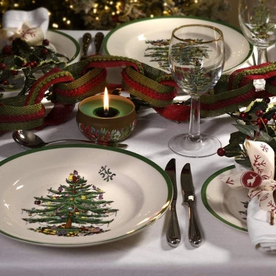 - Festive Christmas Tree Design: These holiday-themed dinner plates feature Spode’s iconic evergreen tree, adorned with colorful ornaments and presents. With a rich green border, it brings festive charm to every meal and enhances your holiday table setting.