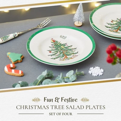 - Festive Christmas Tree Design: This holiday-themed salad plate features Spode’s iconic evergreen tree, adorned with colorful ornaments and presents. With a rich green border, it brings festive charm to every meal and enhances your holiday table setting.