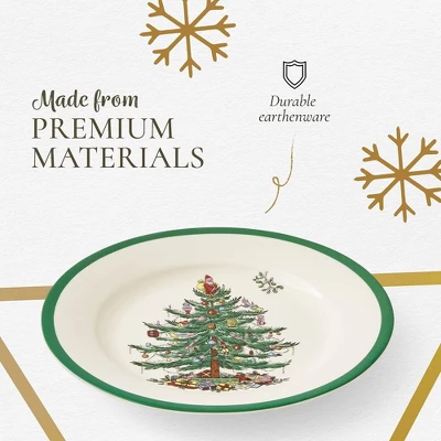 Bring festive joy to your holiday meals with the Spode Christmas Tree 8-Inch Salad Plate. This durable appetizer plate showcases Spode’s signature Christmas tree design, set against a classic white background with a rich green border. Whether you’re hosting a large family gathering or enjoying a quiet holiday meal, this elegant salad plate adds festive charm to any table. Crafted from durable stoneware, this plate is built to last through countless holiday seasons. It resists scratches, won’t absorb odors, and remains vibrant after repeated use. Designed with both beauty and practicality in mind, this stylish salad plate is microwave, dishwasher, oven, and freezer safe, offering you the flexibility to prepare, serve, and store food with ease. You can go from oven to table, then to the freezer for leftovers, making it a practical addition to your Christmas tableware set.The plate’s scalloped edge, bordered by a vibrant green band, enhances its elegant design, while the mistletoe accents provide an extra touch of holiday spirit. This piece easily complements other festive holiday tableware in the Spode Christmas Tree collection, allowing you to create a cohesive and stunning holiday table setting. As part of an evolving collection, Spode adds new pieces every year, making these plates not just durable everyday plates but also cherished collectibles that can be passed down through generations. Whether you’re expanding your own holiday collection or looking for the perfect gift, this Christmas-themed salad plate brings warmth, tradition, and festive joy to any home. Celebrate the holidays in style with this timeless piece of seasonal dinnerware that combines beauty, durability, and convenience.