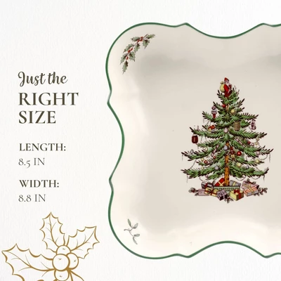 - Festive and Functional Design: Enhance your holiday meals with the Spode Christmas Tree Devonia Tray. This 8.5-inch square serving bowl adds a touch of Christmas magic to your table, making it an essential piece of Holiday Tableware for family meals and festive gatherings.