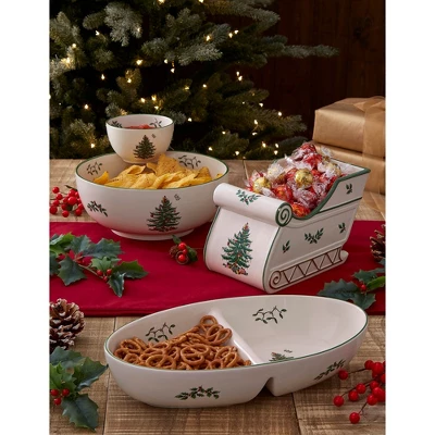 Add festive charm to your table with the Spode Christmas Tree Large Divided Server. This 9-inch round serving platter features the classic Christmas Tree motif, bringing a nostalgic touch to your holiday tableware and enhancing your seasonal table decor. Ideal for serving side dishes, dips, fruit, and salads, this festive serveware provides a stylish way to present your favorite holiday recipes. Its fine porcelain construction ensures durability and an elegant look, while being dishwasher, microwave, and freezer safe for convenience during holiday entertaining.The 9-inch diameter of this divided serving tray offers ample space for generous portions, making it suitable for family gatherings and Christmas parties. It adds both functionality and style to your holiday dining. As part of the Christmas Tree collection, this server is an important piece for collectors and those who value holiday traditions. It beautifully complements other items in the collection, enriching your festive table setting. The Spode Christmas Tree Large Divided Server continues the celebrated tradition of the Christmas Tree design, adding charm to your table and helping create memorable moments during the holiday season. This elegant piece of Christmas tableware is ideal for enhancing your holiday celebrations.