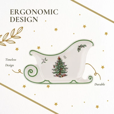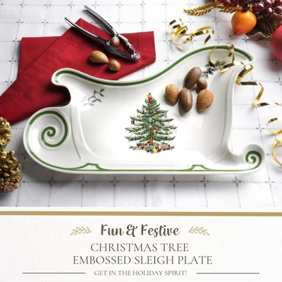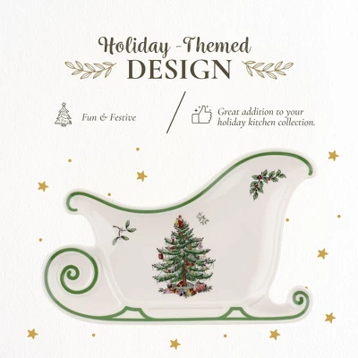 - Holiday Elegance in Porcelain: This Spode Christmas Tree Embossed Sleigh Plate adds a delightful charm to any gathering. Its 9-inch sleigh-shaped design captures the magic of the season, making it the centerpiece of your holiday tableware.