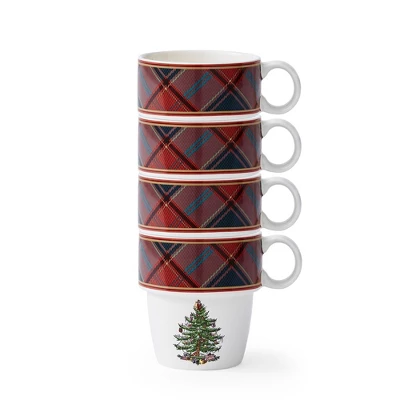 Celebrate the holiday season in style with the Spode Christmas Tree Tartan Stacking Mugs. This set of 4 festive mugs combines traditional tartan plaid with a charming Christmas tree motif to create a delightful addition to your seasonal tableware. These stackable mugs are perfect for saving space in your kitchen while adding a festive touch to your drinkware collection.With a generous 10oz capacity, these mugs are designed for enjoying all your favorite hot beverages. Whether you’re sipping on coffee, tea, or hot chocolate, these mugs provide ample room for your drinks, making them ideal for cozy winter mornings or festive holiday parties. The space-saving design allows the mugs to nest easily when not in use, keeping your kitchen organized and clutter-free. Crafted from fine earthenware, these holiday coffee mugs are built to last. Their durable construction makes them suitable for everyday use, and they are safe for the dishwasher, microwave, freezer, and oven. Unlike plastic, they won’t absorb odors or discolor, ensuring that your drinks taste fresh every time.The mugs feature an easy-to-hold handle, providing a comfortable grip that enhances your drinking experience. Whether you’re hosting a holiday brunch or relaxing with a warm beverage by the fireplace, these tartan design coffee cups add a touch of festive charm to any occasion. Looking for a thoughtful gift? This set of Christmas stacking mugs is a delightful present for family and friends. Enhance your holiday traditions with the Spode Christmas Tree Tartan Stacking Mugs—a festive, fun, and functional way to celebrate the most wonderful time of the year!