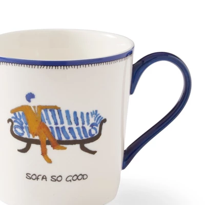 - Product Specification: 12oz Mug featuring a suited man enjoying his blue sofa is accompanied by the playful tagline, ‘Sofa So Good’. Finished with a dark blue colored rim and matching handle. This mug is Dishwasher Safe.