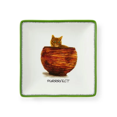 - Product Specification: 4.5 inch square shaped platter featuring a bright red border enclosing a whimsical painted illustration in vibrant shades. This serving platter is Dishwasher Safe.