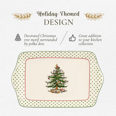 - Playful Polka Dot Design: This tray features a joyful polka dot design that surrounds the classic Spode Christmas Tree, creating a festive and fun addition to your holiday table. The combination of traditional and whimsical elements makes it a standout piece in your Christmas serveware collection.