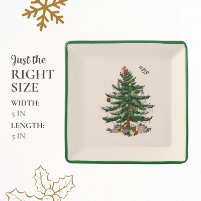 Bring festive charm to your holiday table with the Spode Christmas Tree Tidbit Square Plates, a set of 4 ceramic plates that will make your holiday gatherings more delightful. Each plate measures 5 inches, making them ideal for serving canapés, desserts, small appetizers, and sweets. Whether you’re hosting a formal dinner or a casual cocktail party, these appetizer serving plates are perfect for adding a touch of seasonal warmth to every dish you serve.The Christmas Tree Tidbit Plates are adorned with Spode’s iconic Christmas tree motif, a design cherished for its nostalgic appeal and its ability to evoke warm memories of Christmases past. These plates aren’t just for show—they’re highly functional, being dishwasher, microwave, and freezer safe. Whether you’re reheating leftovers, storing food, or quickly cleaning up after a meal, these plates offer convenience without sacrificing style.Made from durable ceramic, these plates are built to last and handle the rigors of holiday entertaining. Their sturdy construction ensures they can be used throughout the season for a variety of purposes, from serving sweets during cocktail hour to acting as the perfect snack plates for parties. The versatility of the 5-inch size makes them a go-to choice for small bites or even as side plates for larger meals. Whether gifted as a stand-alone set or paired with other items from the Spode Christmas Tree collection, they bring joy and festive spirit to any home. The plates can be easily mixed and matched with other holiday dinnerware collections, allowing you to create the ultimate holiday tablescape. Designed for both beauty and functionality, these tidbit plates will elevate your holiday gatherings, creating lasting memories with family and friends.