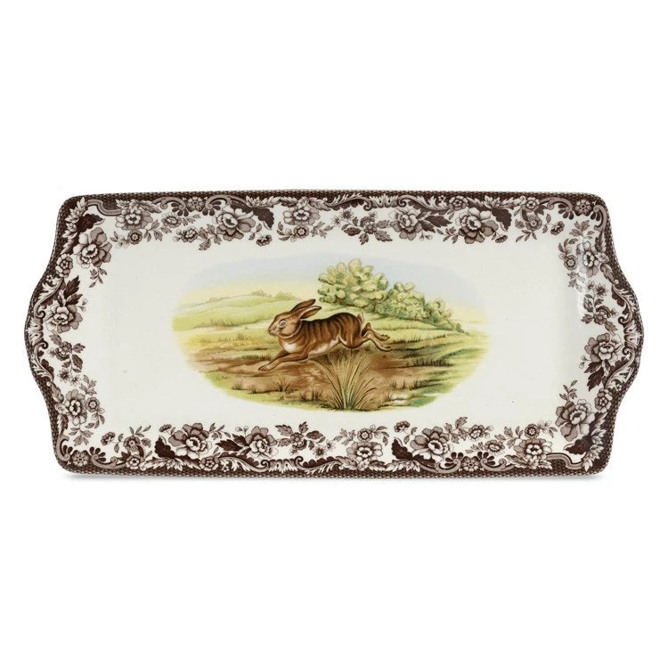 Spode’s Woodland tableware collection features fine studies of British game animals framed by a stylized, floral border. This handsome range of tableware, serving pieces and cookware perfectly encapsulates country living and is evocative of English country pursuits, bringing a unique theme to any home. The border, named British Flowers, dates back to c1828 and effortlessly complements each scene. Made with the finest materials the collection is perfect for modern day living with earthenware and porcelain items being dishwasher and microwave safe, oven and freezer proof. This 13″ sandwich tray is part of the Rabbit Collection.